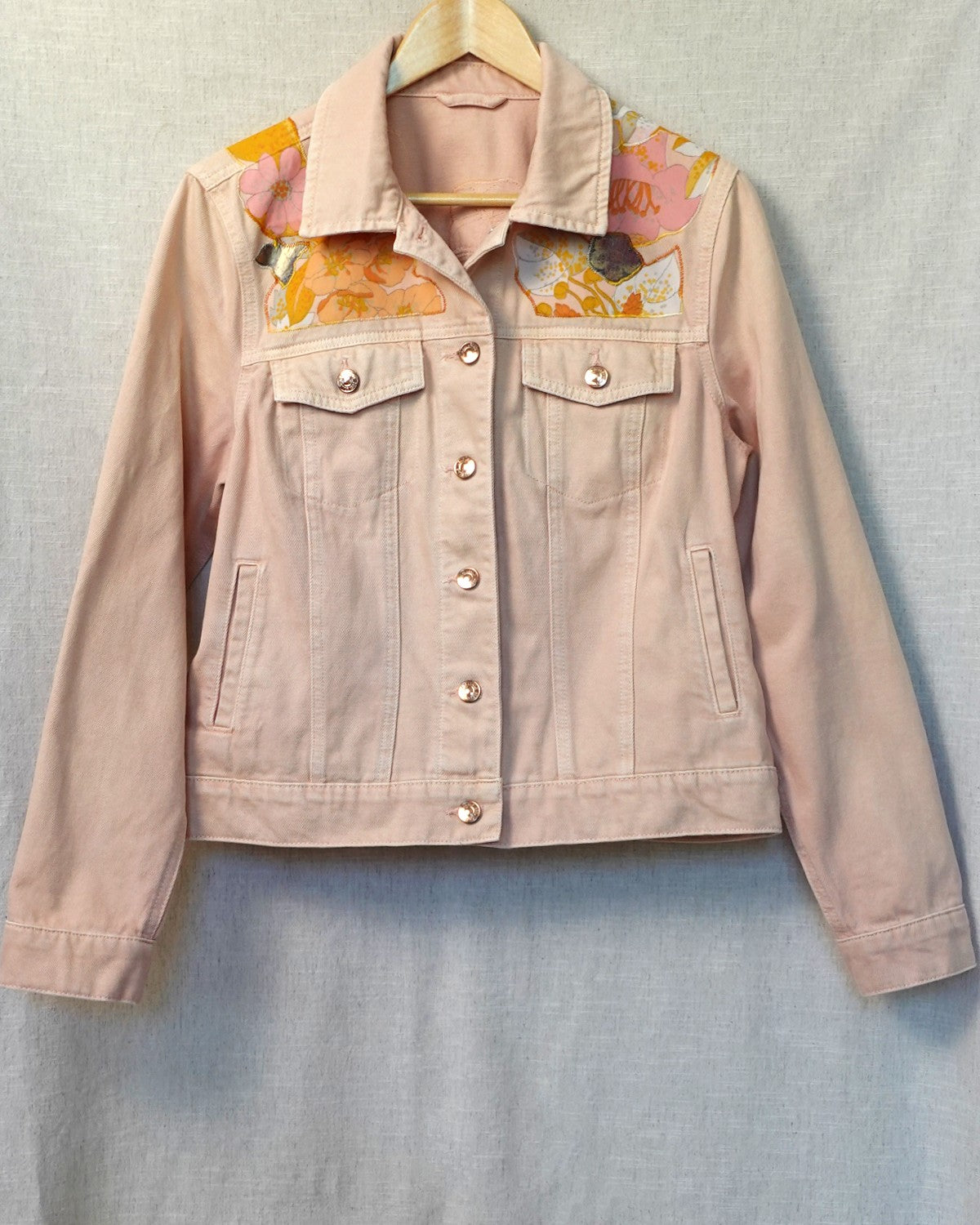 Bold, bright and ready to shine, The Gloria is for those who like their style with a bit of sparkle and a lot of personality. This pale pink preloved denim jacket is brought to life with vivid orange floral fabric, full of summer energy, and finished with metallic touches that catch the light beautifully.
